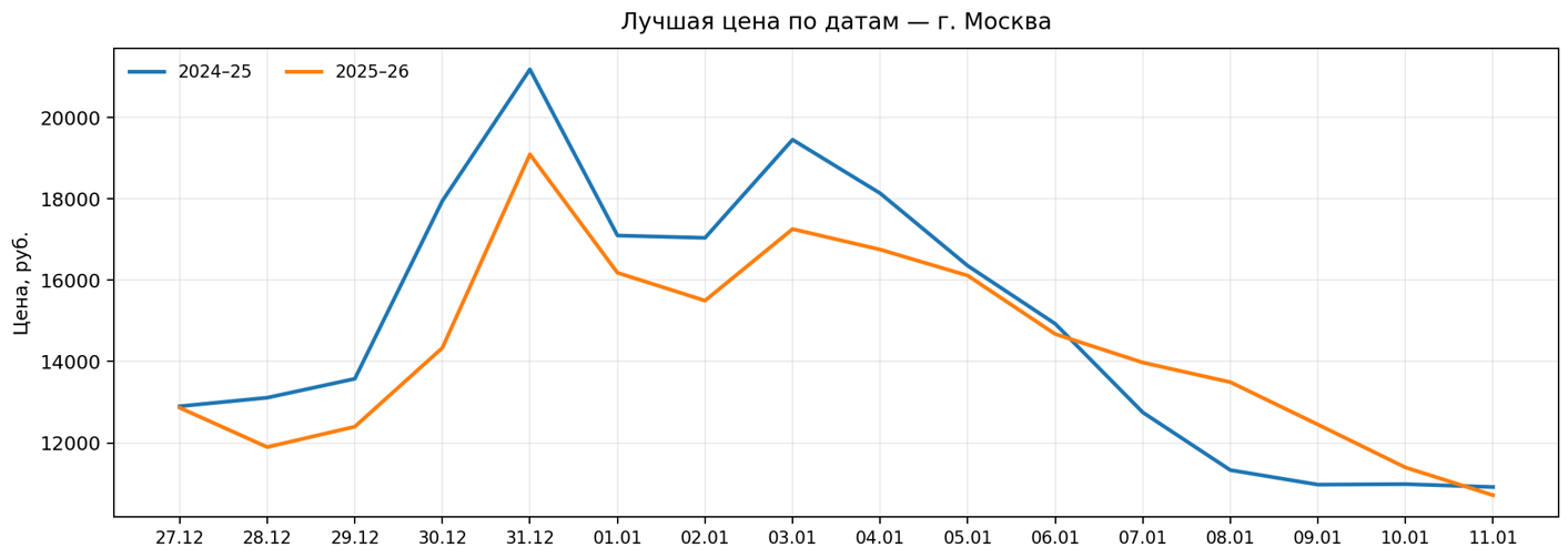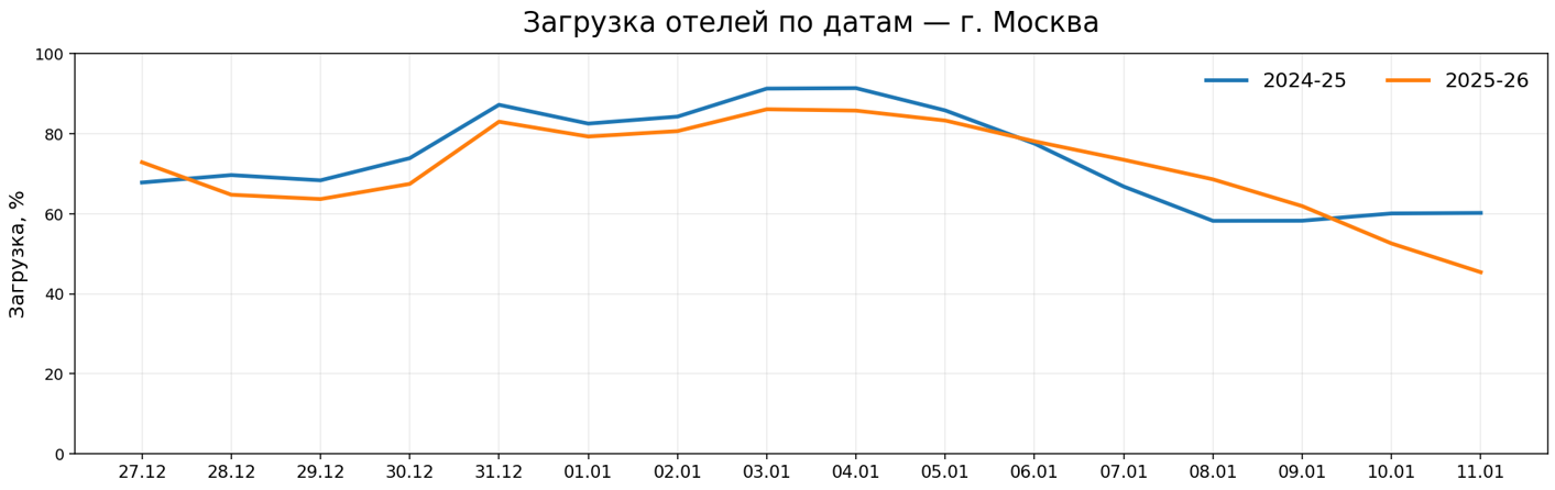 Короткий анализ новогодних дат: загрузка отелей и лучшая цена в регионе г. Москва. Сравнение периодов 2024–25 и 2025–26.