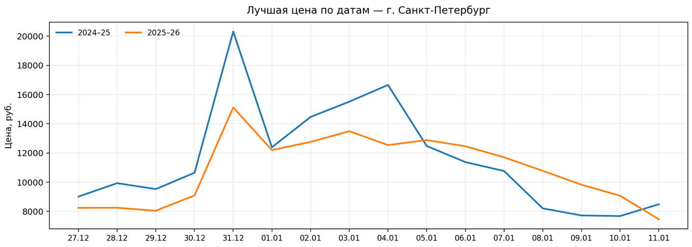 Короткий анализ новогодних дат: загрузка отелей и лучшая цена в регионе г. Санкт-Петербург. Сравнение периодов 2024–25 и 2025–26.