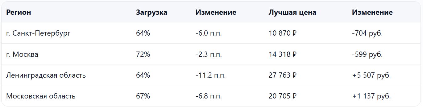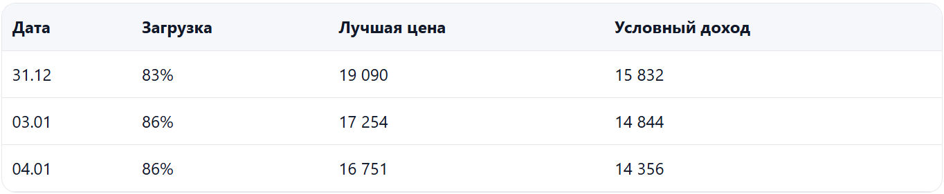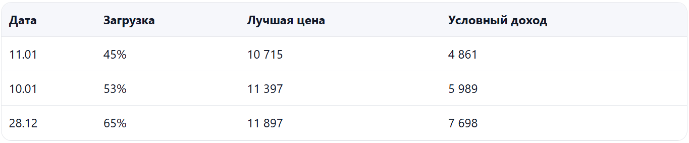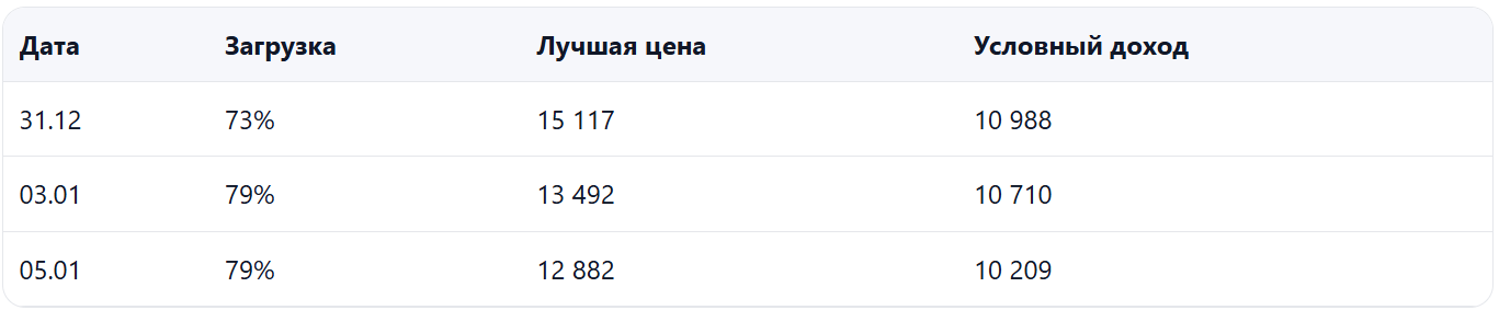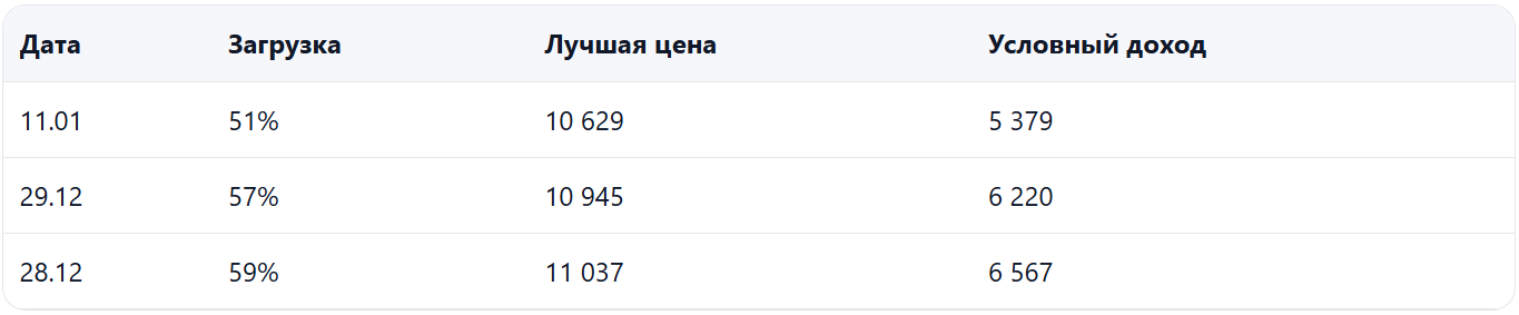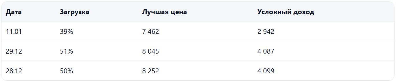 - Спрос стал слабее, загрузка заметно ниже прошлого года при умеренном снижении цены — есть риск недобора выручки именно на «проседающих» датах.