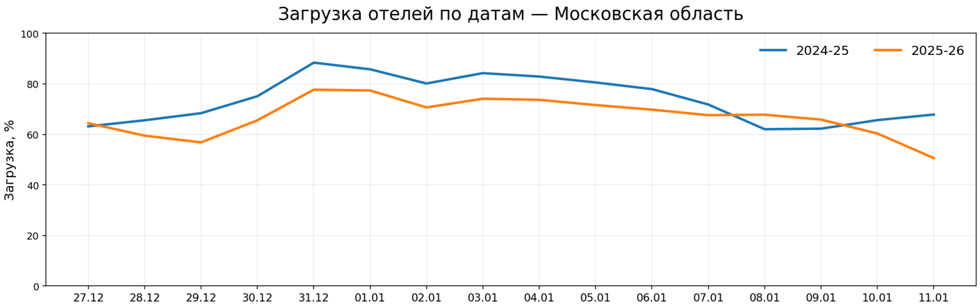 Короткий анализ новогодних дат: загрузка отелей и лучшая цена в регионе Московская область. Сравнение периодов 2024–25 и 2025–26.