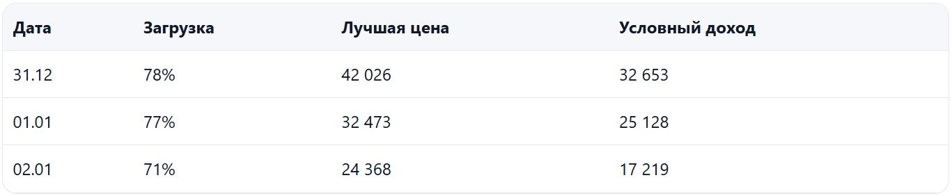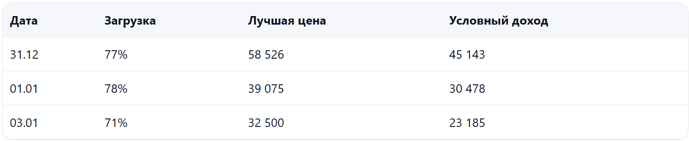 Данные собраны по датам конца декабря и начала января. Ниже — компактная сводка по регионам и полезные таблицы «сильных» и «слабых» дат для управления ценой, затем короткие выводы.