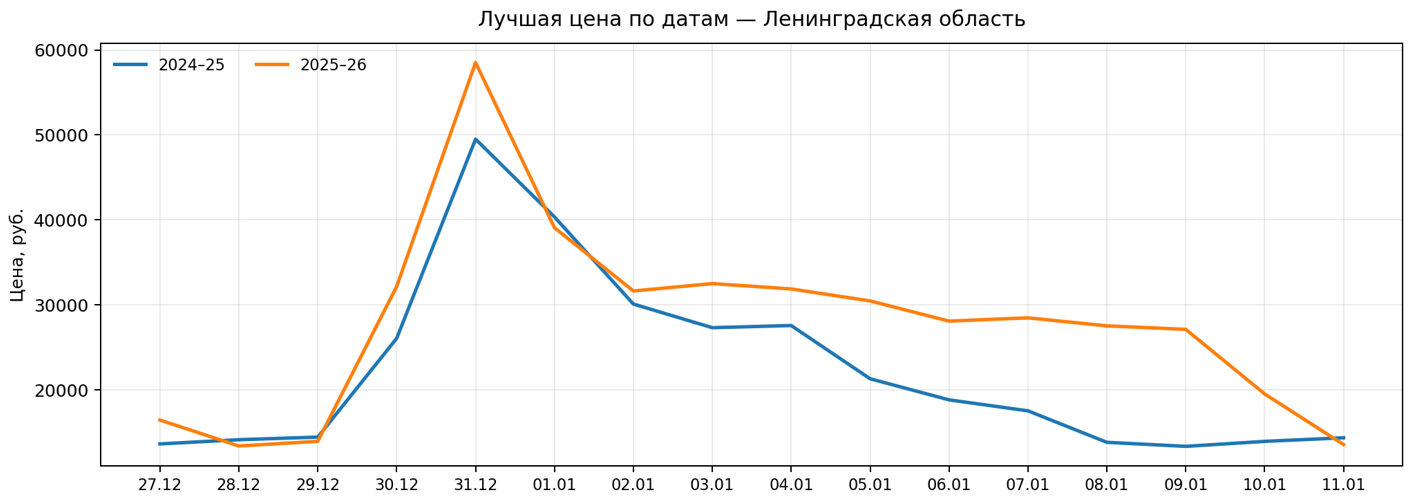 Короткий анализ новогодних дат: загрузка отелей и лучшая цена в регионе Ленинградская область. Сравнение периодов 2024–25 и 2025–26.