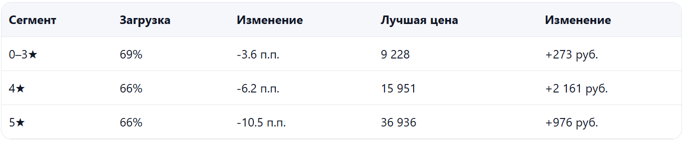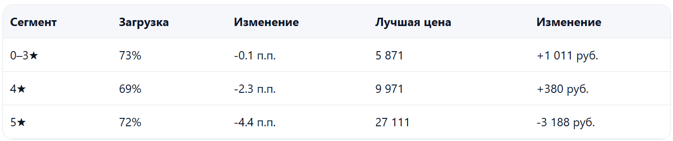 - Спрос ослаб, при этом средняя цена выросла, особенно в 4–5★, что усилило разрыв между сегментами и сделало часть дат менее конкурентоспособными.