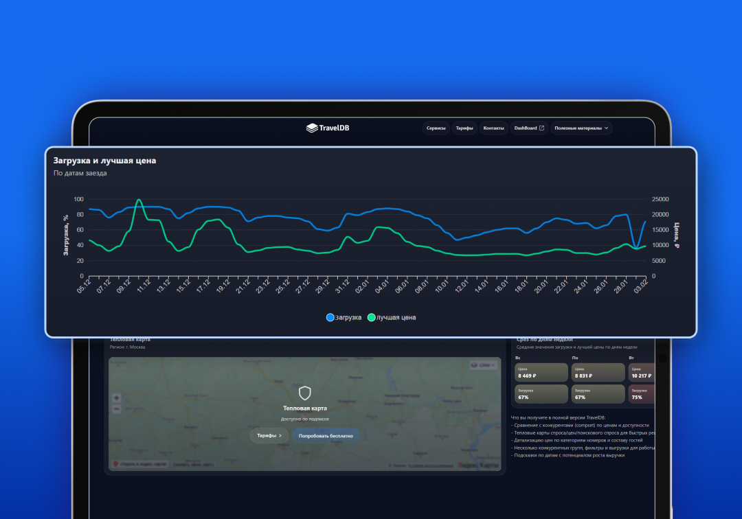 В публичном дашборде эта функция является интерактивным элементом, который демонстрирует возможности полной версии TravelDB. В профессиональном тарифе тепловые карты визуализируют спрос, цены или поисковую активность по дням, позволяя буквально за секунды определить «горячие» (перспективные) и «холодные» даты в календаре.