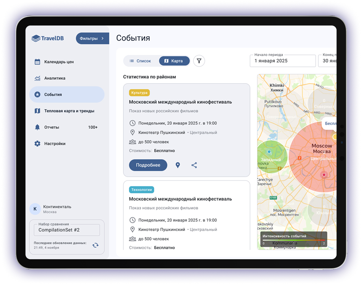 Календарь мероприятий в TravelDB позволяет увидеть важные мероприятия в городе, формирующие спрос. Заранее скорректировав тарифы и условия бронирования на такие даты, вы увеличиваете свои шансы на получение дополнительного дохода.
